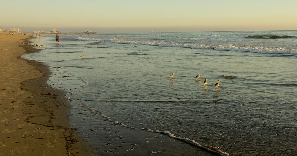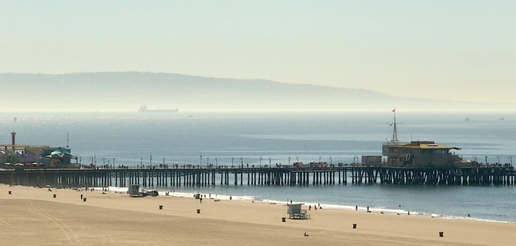 The pier and beach with a few people on it already, plus the ship in the haze , coming out of Los Angeles.