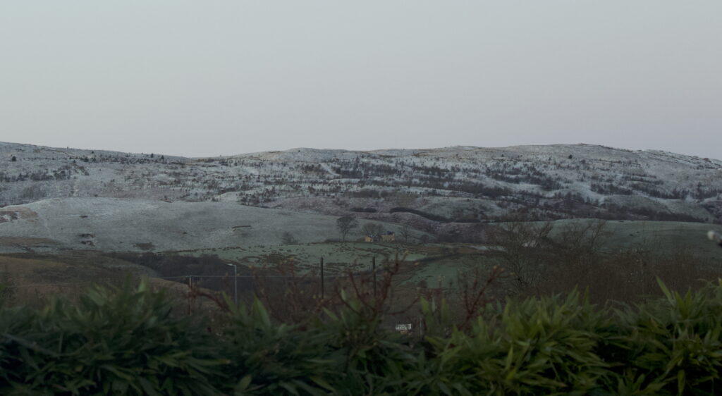 Saw the forecast and realised our old home would be getting snow, but over here on the West Coast snow is a fairly rare event , because of the Gulf Stream etc. As you will see the higher hills got an icing sugar coating of snow, but none with us. What I wasn’t expecting was this very cold snap we are experiencing. Three nights running we have been down to minus five C and last night went down to just below minus six, so fairly nippy.