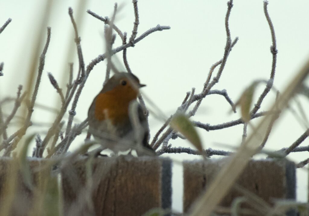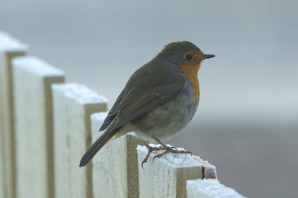 My feet would be frozen standing on the frosty fence, but it seems nothing to this Robin.
