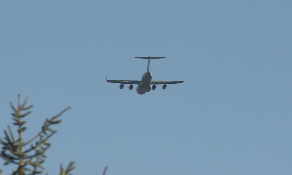 .A Boeing Globemaster from the R.AF. Brize Norton airfield coming in to land at Prestwick Airport just 3500 feet above us, it stayed on the ground at Prestwick for about ten minutes, waited for an Airbus A400M to touch and take off (also from Brize Norton) and followed it home. Missed the A400 but captured the Globemaster as it flew a bit further West of us on the return journey (below).