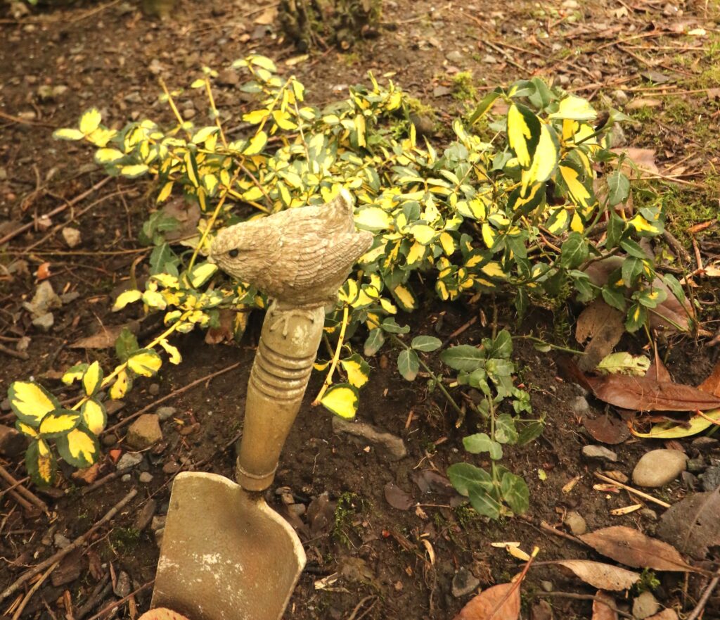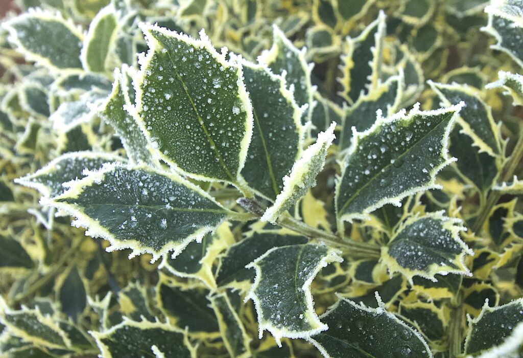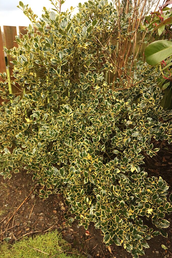 A variegated Holly that has proved colourful throughout the Winter, plus a good hiding place close to the feeders when the Sparrowhawk is around.\
