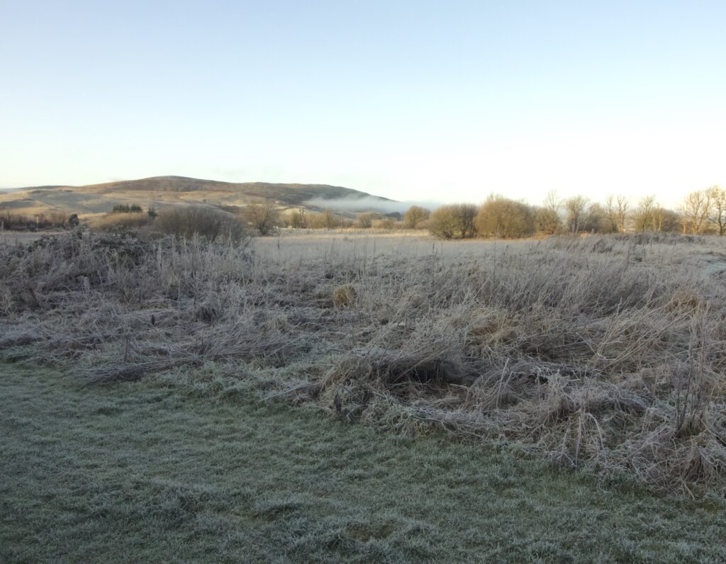 The frosty nature reserve the other side of our fence, mist over the river in the distance.