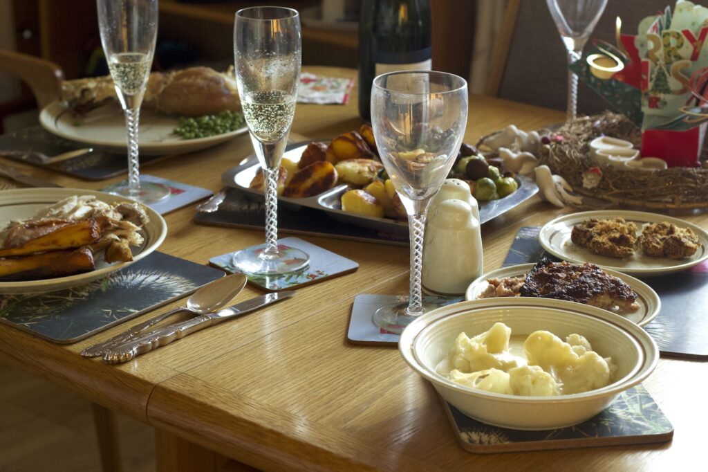 Our home alone Christmas Dinner, right to left Cauliflower Cheese, Sausage meat stuffing, Sage &Thyme stuffing, Brussel Sprouts with chestnuts, Roasted Potatoes and on our plates already plenty of turkey ( we got a “serves nine people” one just for the two us) Roasted Parsnips and peas. Plus of course a glass of bubbly. Christmas pudding was left for Boxing Day as we were so full up.