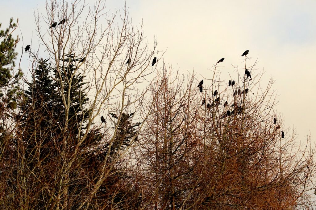 Just going out of our gate for a walk and the house opposite had this “clattering” (that’s what they are called in a collection) of Jackdaws in their trees. “The Birds” all over again.