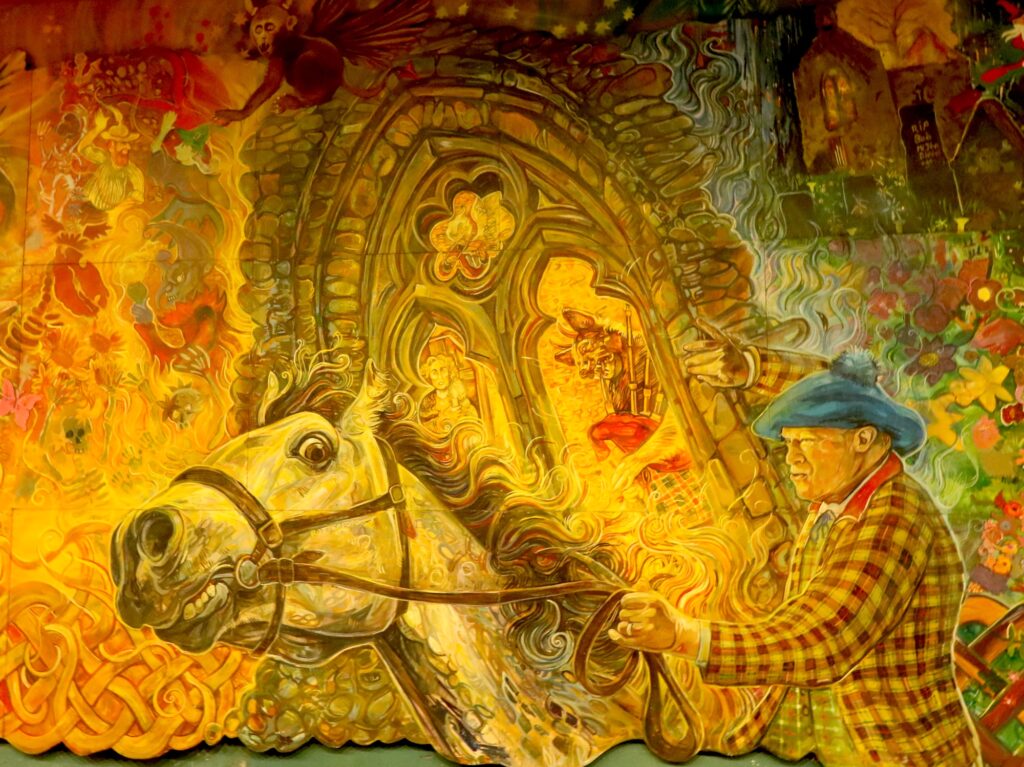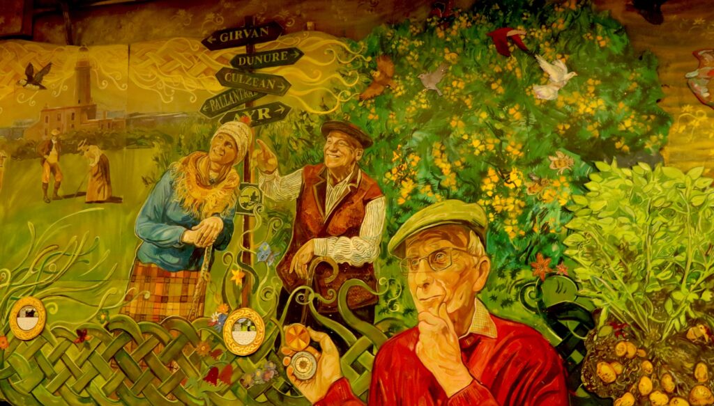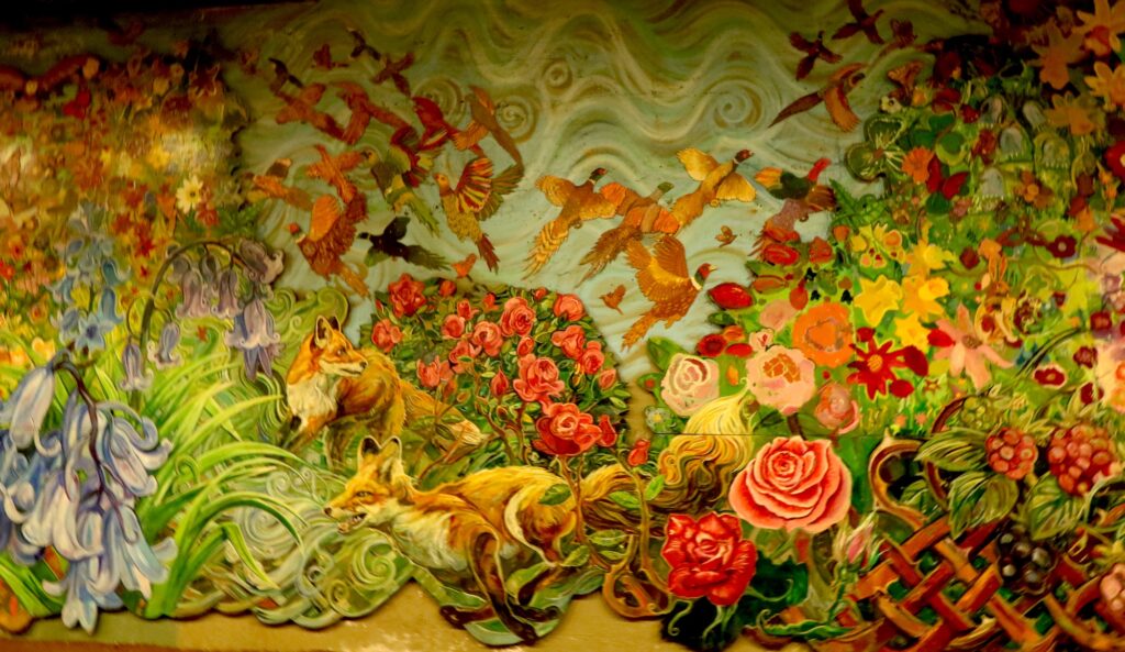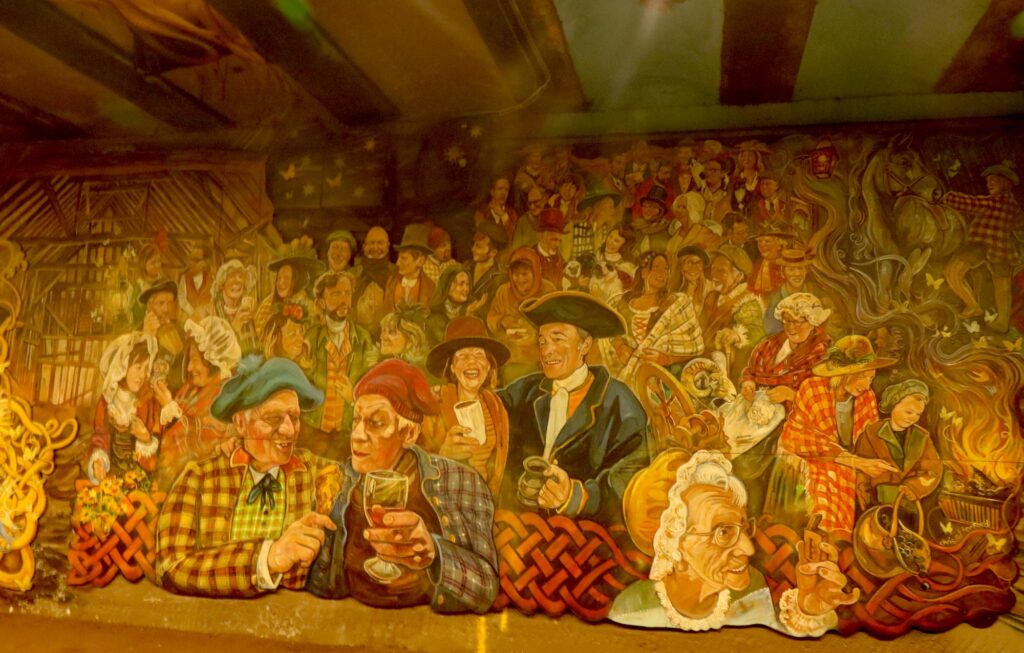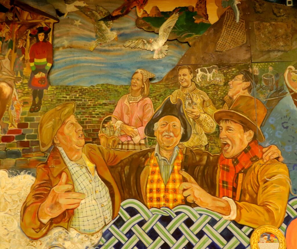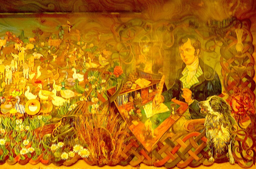 The first part of the mural is of course Rabbie himself sitting at his desk with his ever faithful dog and all the animals he wrote about.