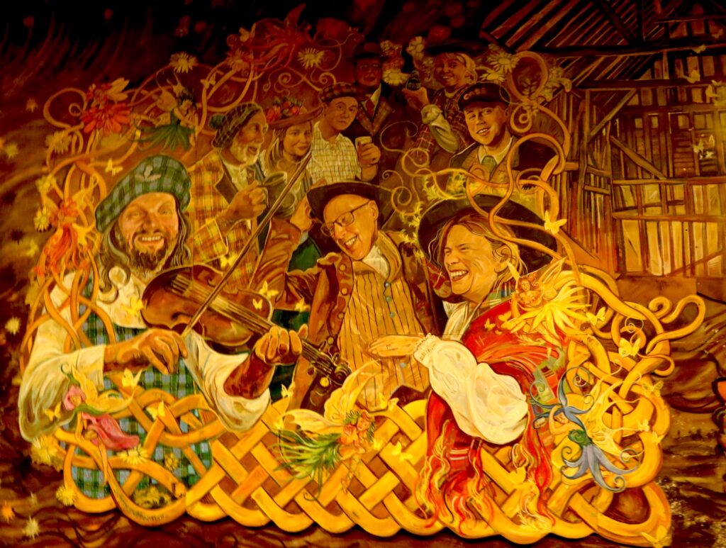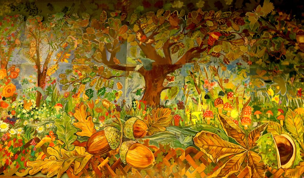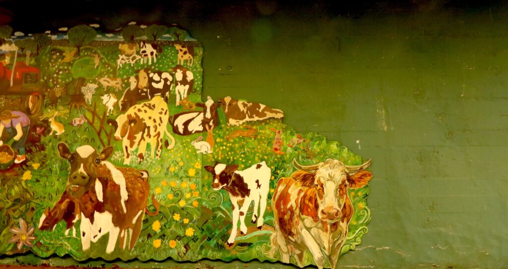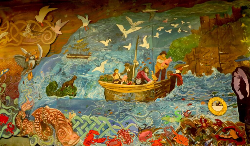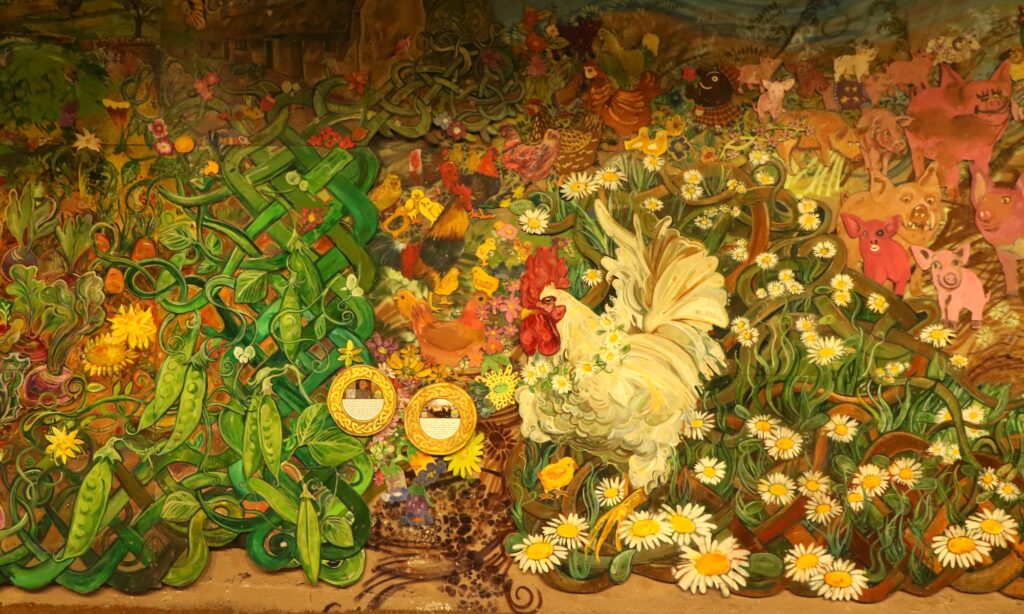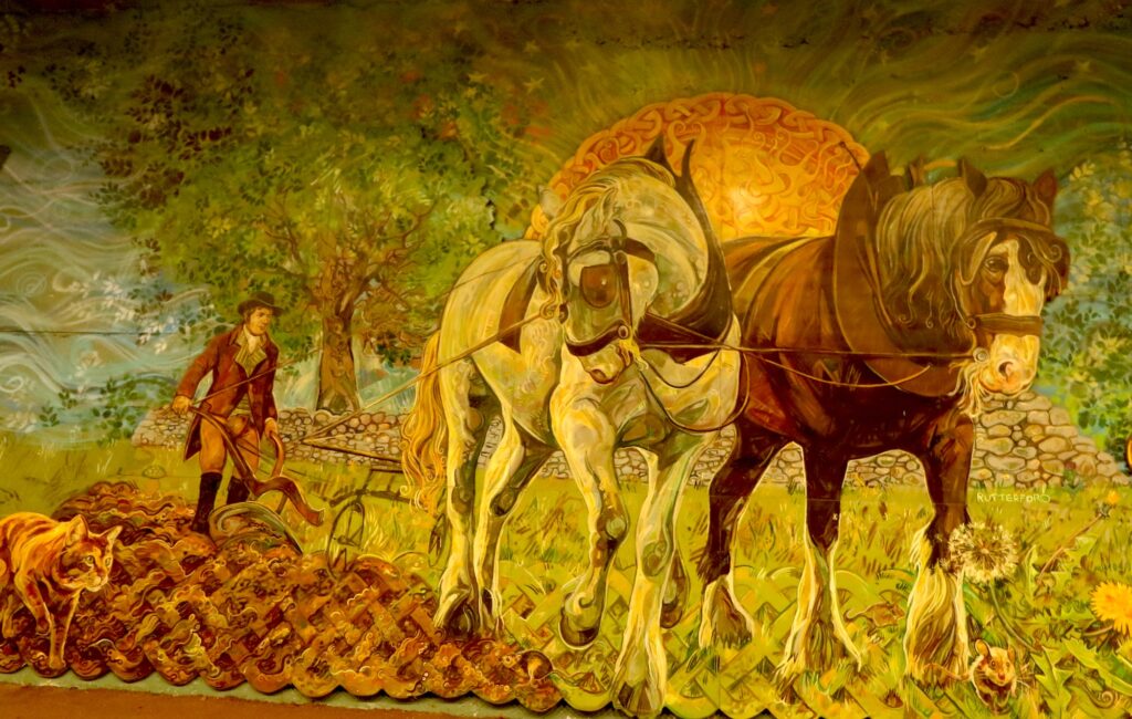 The first part of the mural is of course Rabbie himself sitting at his desk with his ever faithful dog and all the animals he wrote about.