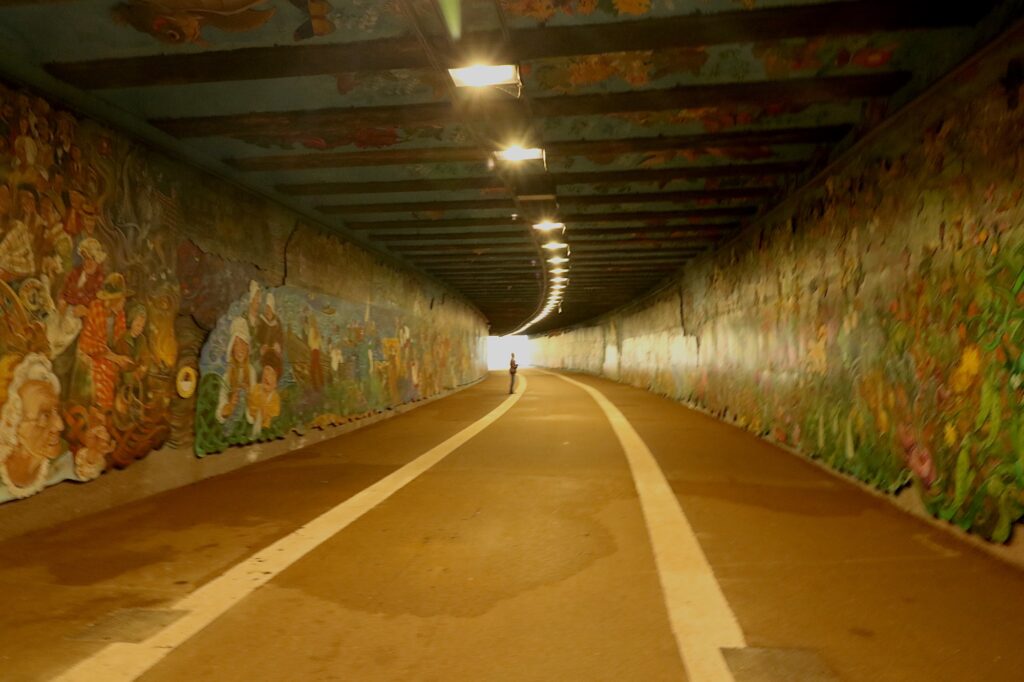 The art is on both sides of the tunnel and even the ceiling is decorated around the lights.