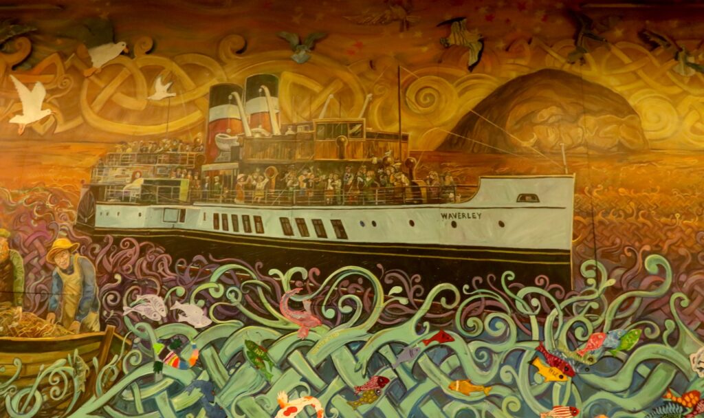 Scenes of the local industries, curling stones on the cart mined from the island Ailsa Craig, the only place in the world where real stones originate from and the paddle steamer Waverly