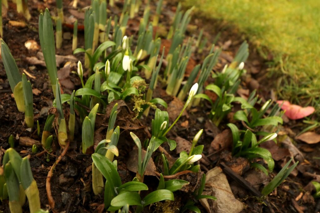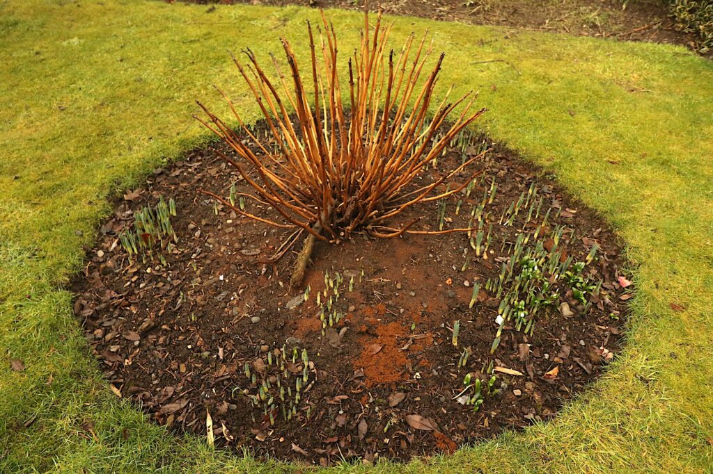 A central bed in our rear garden showing a lot of Daffodils sprouting up plus (as shown in the second shot) a close up of our own Snowdrops opening up, the previous ones were growing on a bank on a walk. The Hydrangea took a bit of a battering in the cold, but I am sure it will start budding up soon, though may not flower this year.
