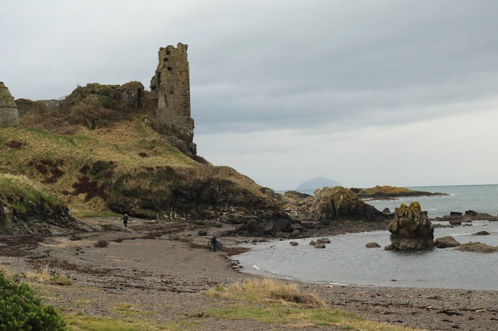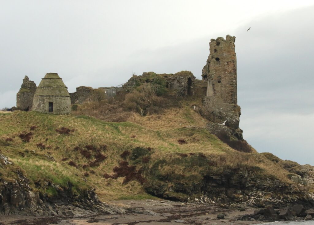 The ruins from the beach, the cone shaped building is the dovecot which held about two hundred nests and kept the castle supplied with meat and eggs.