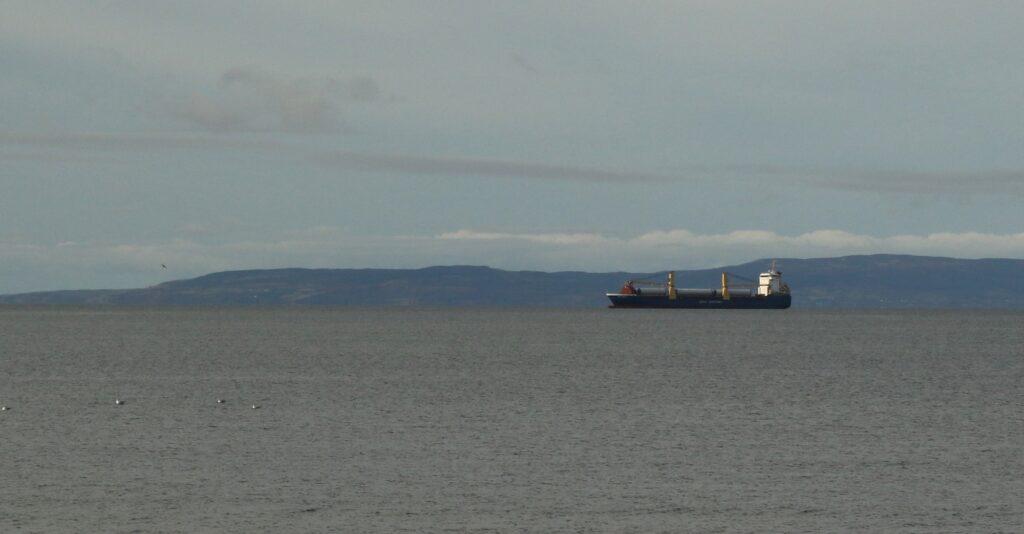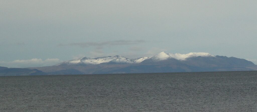 Went into Ayr today for a quick bit of shopping after overnight temperatures of minus eight C and I have scraped the ice of the car. Got into Ayr and it was plus two, ridiculous.Parked in our usual spot with views down to the Firth and captured this ship at anchor awaiting the tide. After shopping drove down to the seafront and got a closer view of the ship, plus the snow capped Corbetts on Arran. Presume the highest is Goat’s Fell to the right of centre.