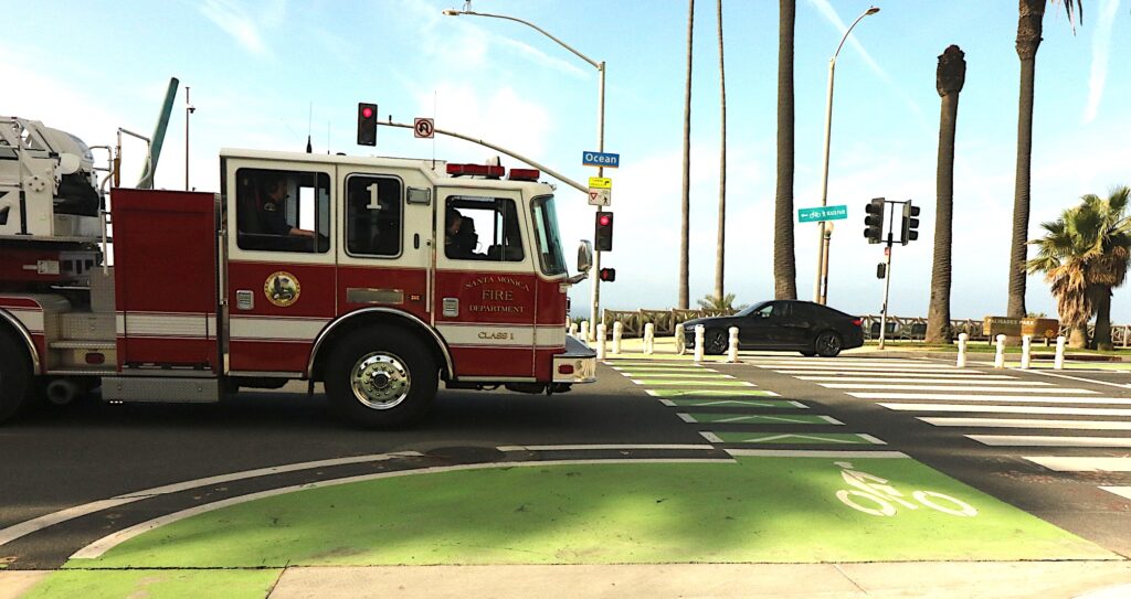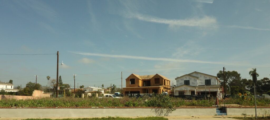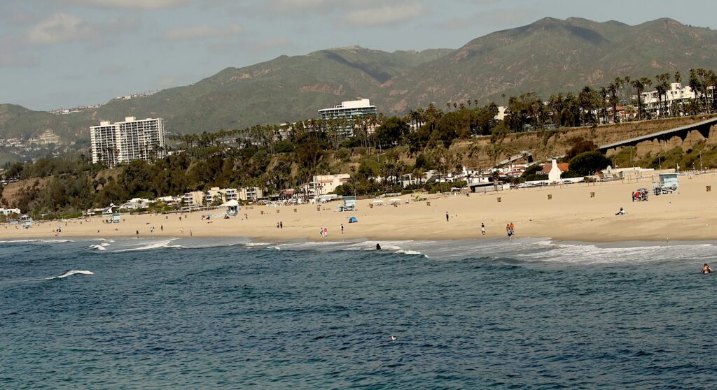 Cliffs, three lane highway, houses, beach , walkway along the beach and then the Ocean.