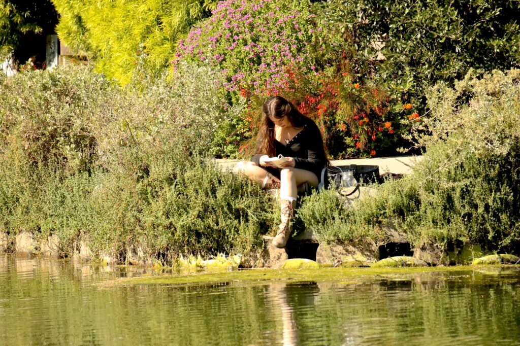 What a lovely lady sitting in a great spot to read her book.