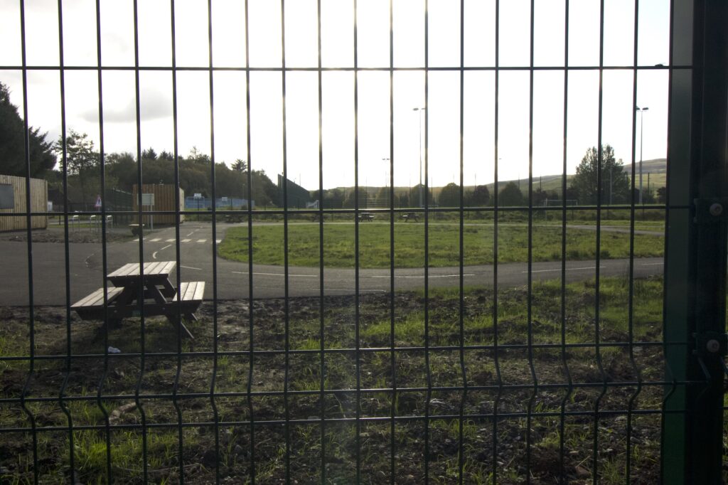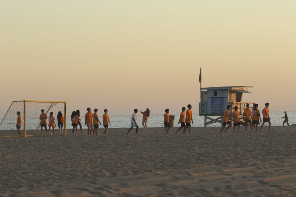 School children playing soccer and volleyball in the twilight.