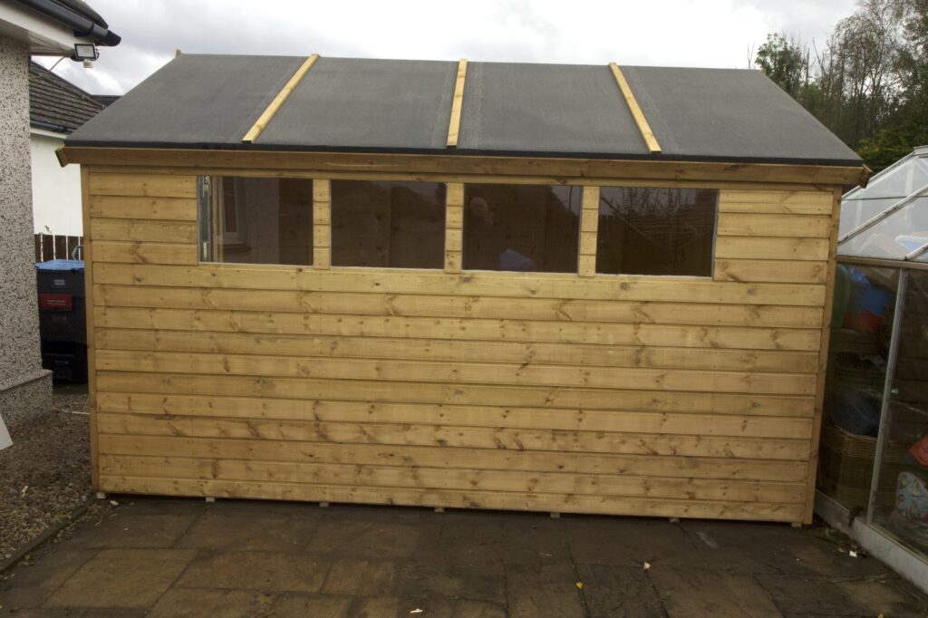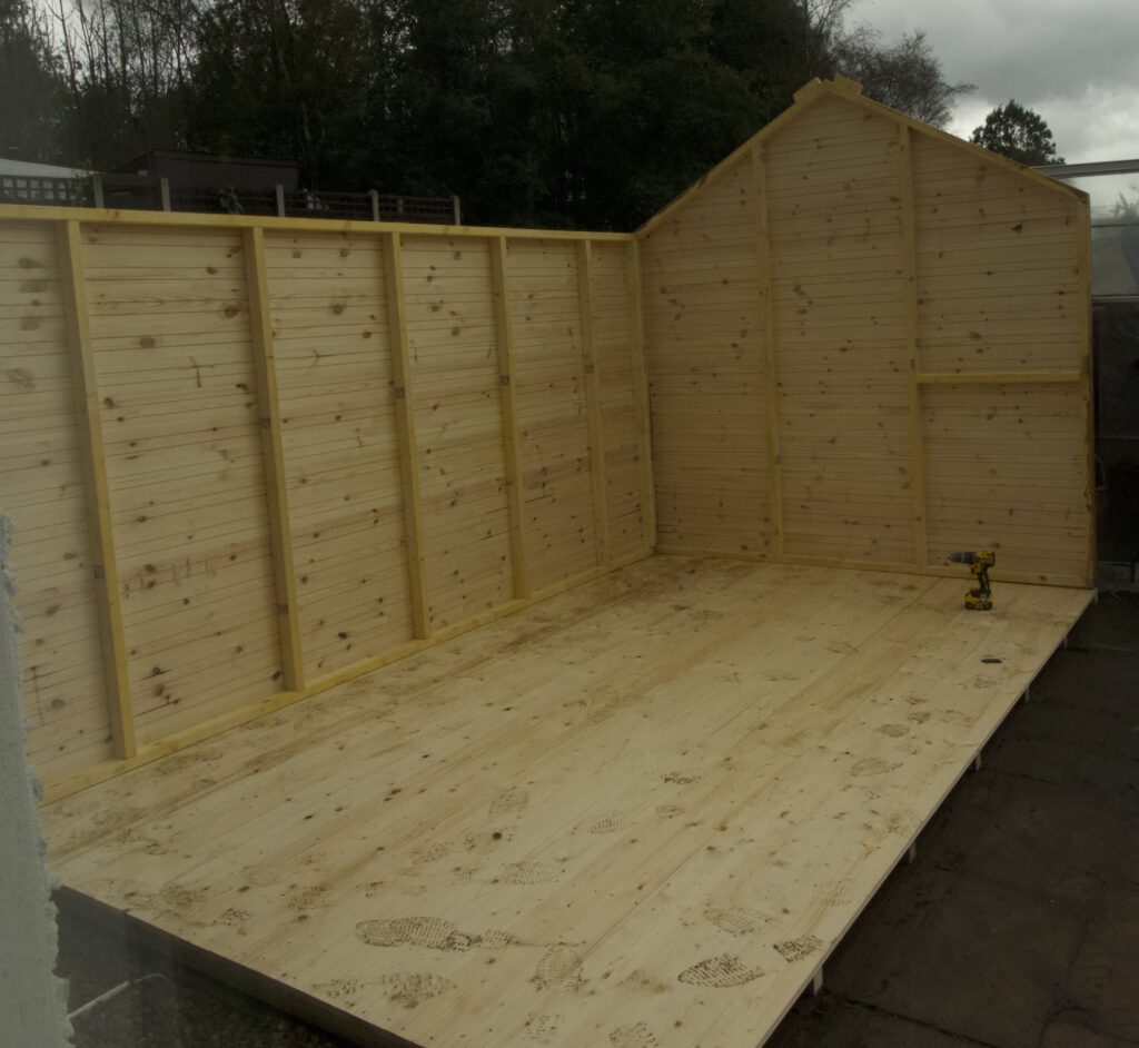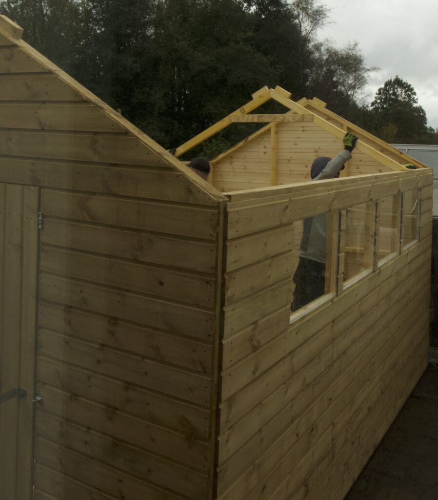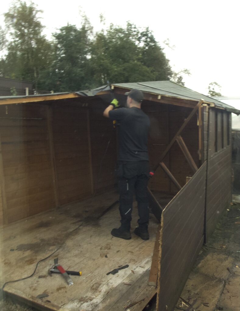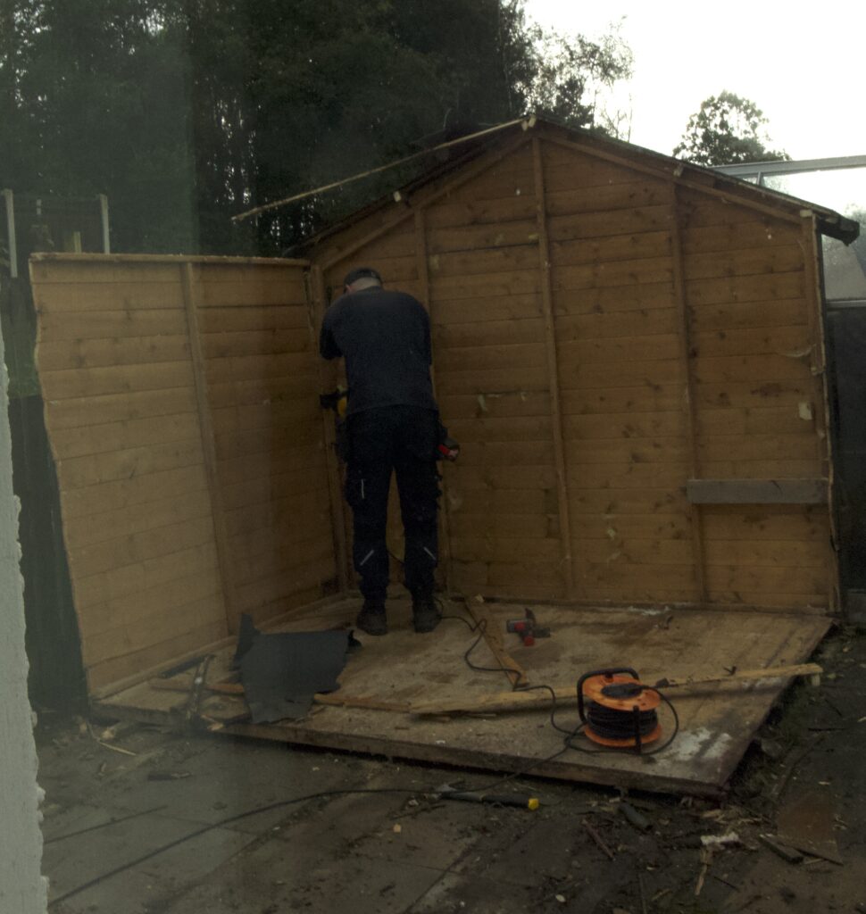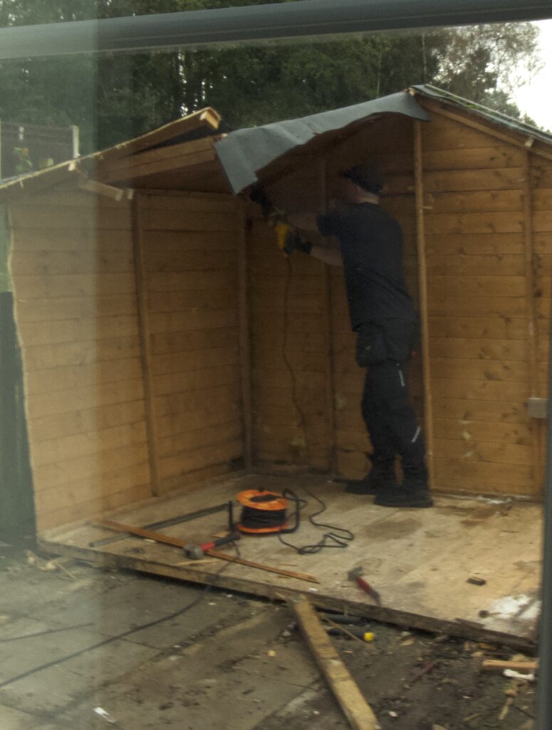Got up half hour early expecting the workshop first thing , phoned at eleven to be told it will be with us after lunch. But when the two lads arrived, did they put a full shift in. Started at two p.m. and where on their way by four forty-five . having un loaded new shed, demolished the old one, erected the new one and strapped the old one on the van, great teamwork.