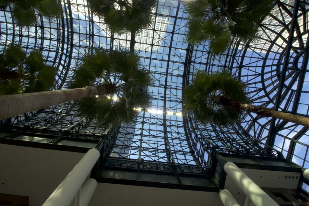 Always love this building, looking up to the glass roof with the Palm Trees nearly touching it now.