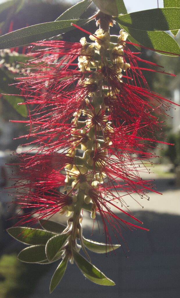 This Bottle Brush tree is outside my son and his wife’s apartment and is head height above you and with the sun shining through it is a real jewel.