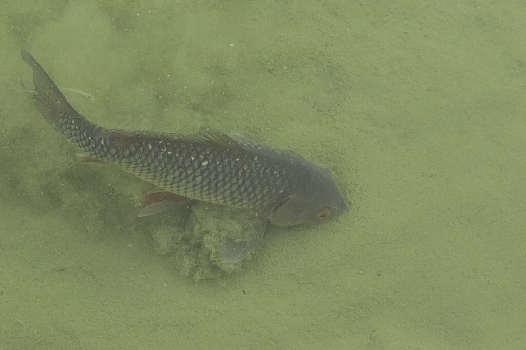 Our favourite sections have always been the Japanese and Chinese gardens with their wonderful structures and natural stone, always involving water and fish and this one shows true Carp feeding nose down in the mud and silt.