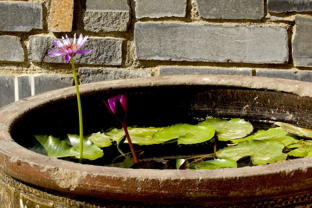 This last shot shows how simple a small pot with two water lilies in can make a corner of a garden look so beautiful and elegant.